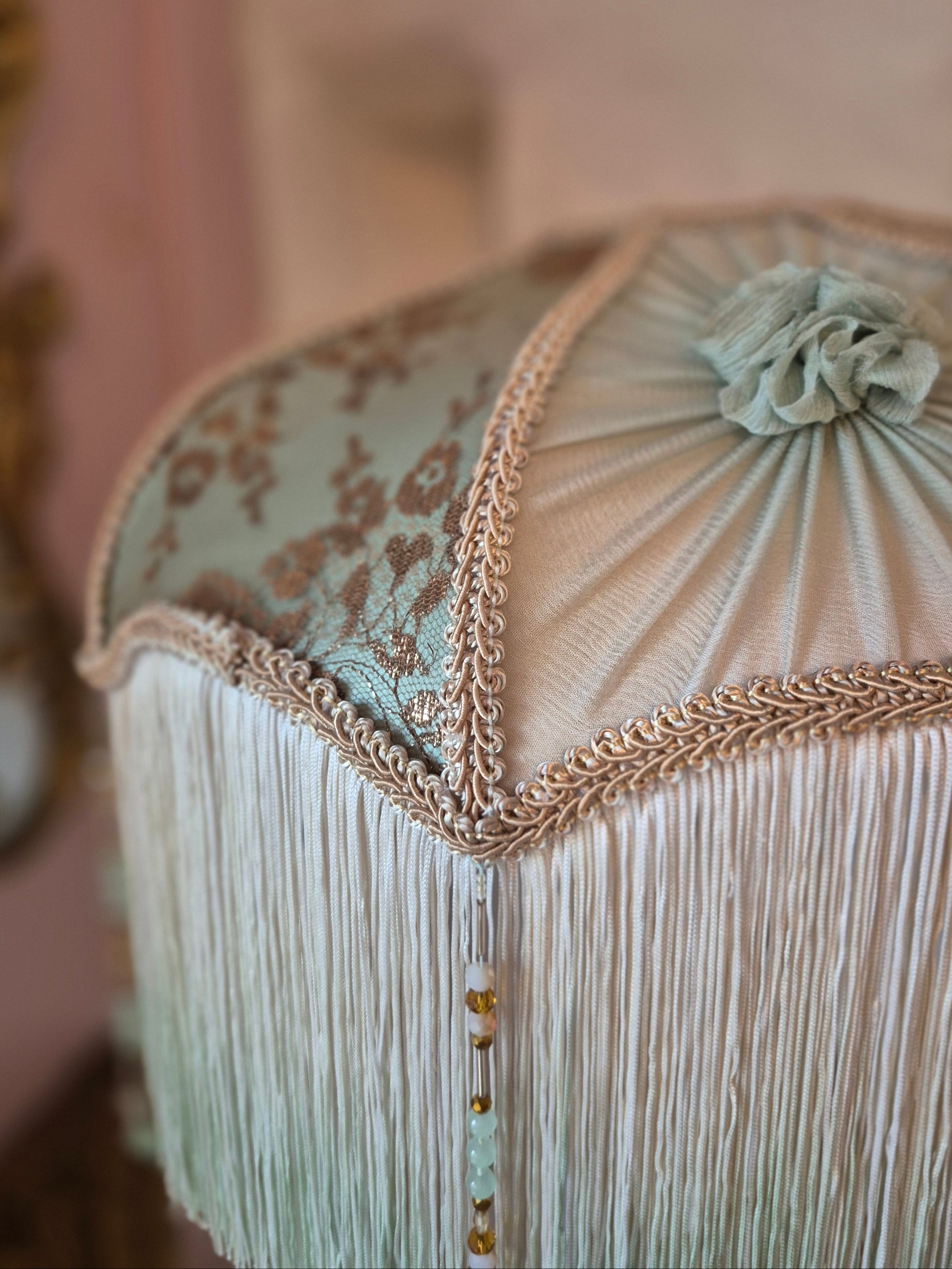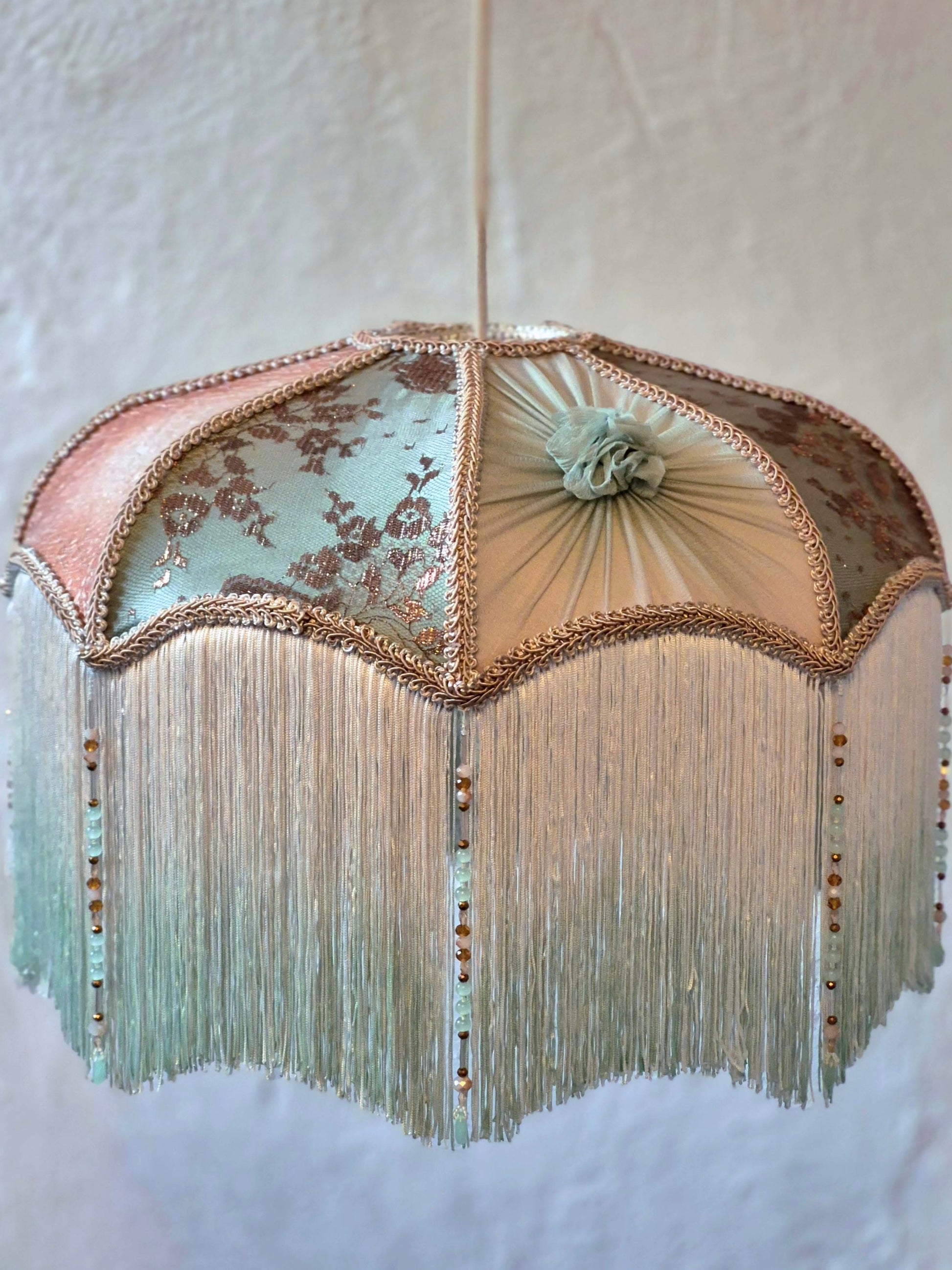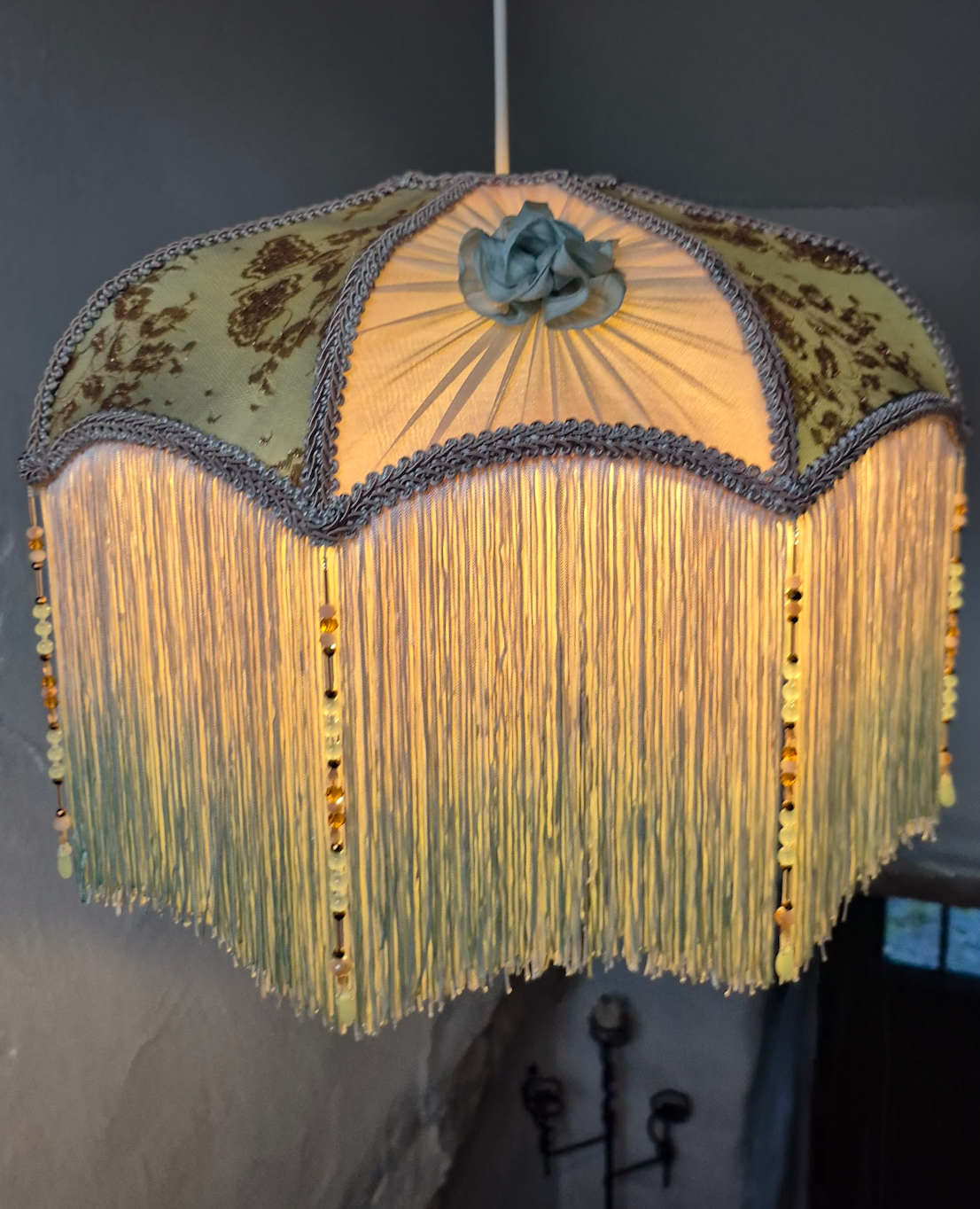 It took me a while to find the exact beads I wanted for this piece but I eventually found the perfect combination of creams and bronzes and jades, and I think they are the perfect jewellery to finish the shade, along with the gold braided trim.