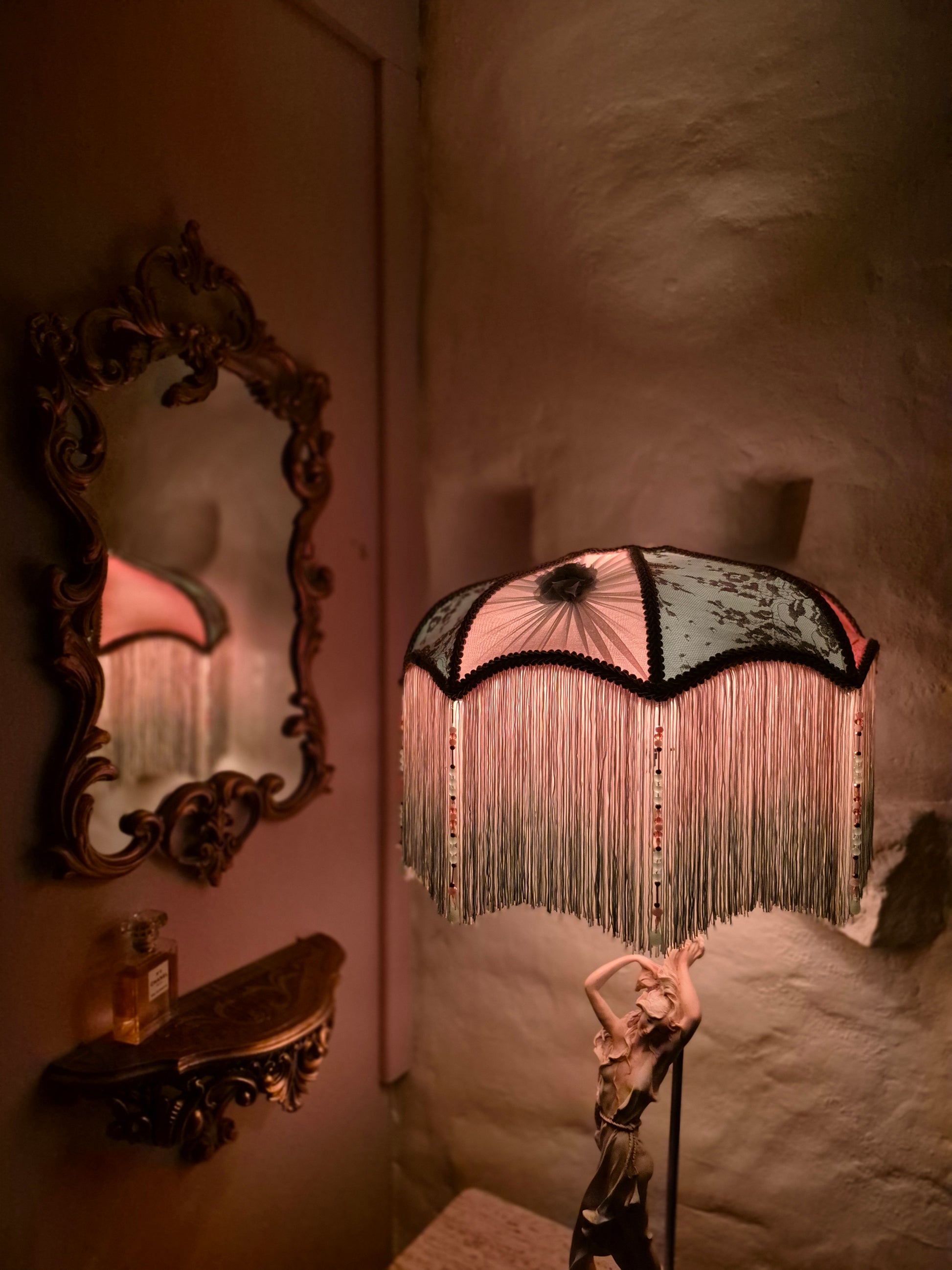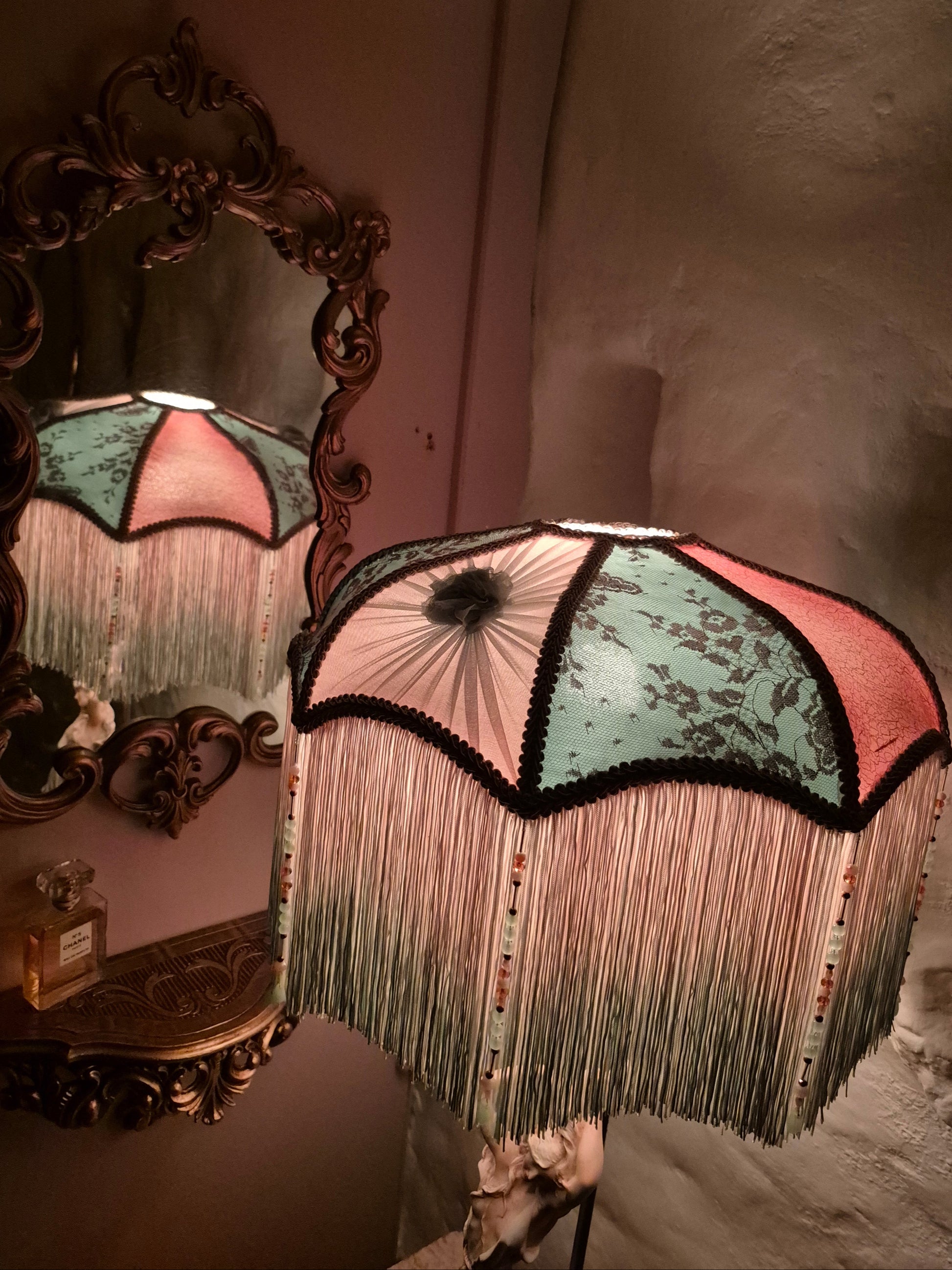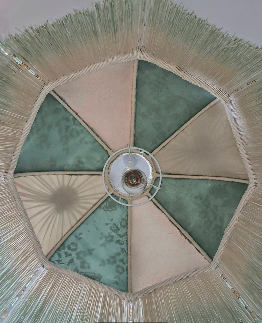 This is a bright shade, that gives off a strong but really nicely diffused light. A warm, low wattage bulb creates a gorgeous shmoozey glow.