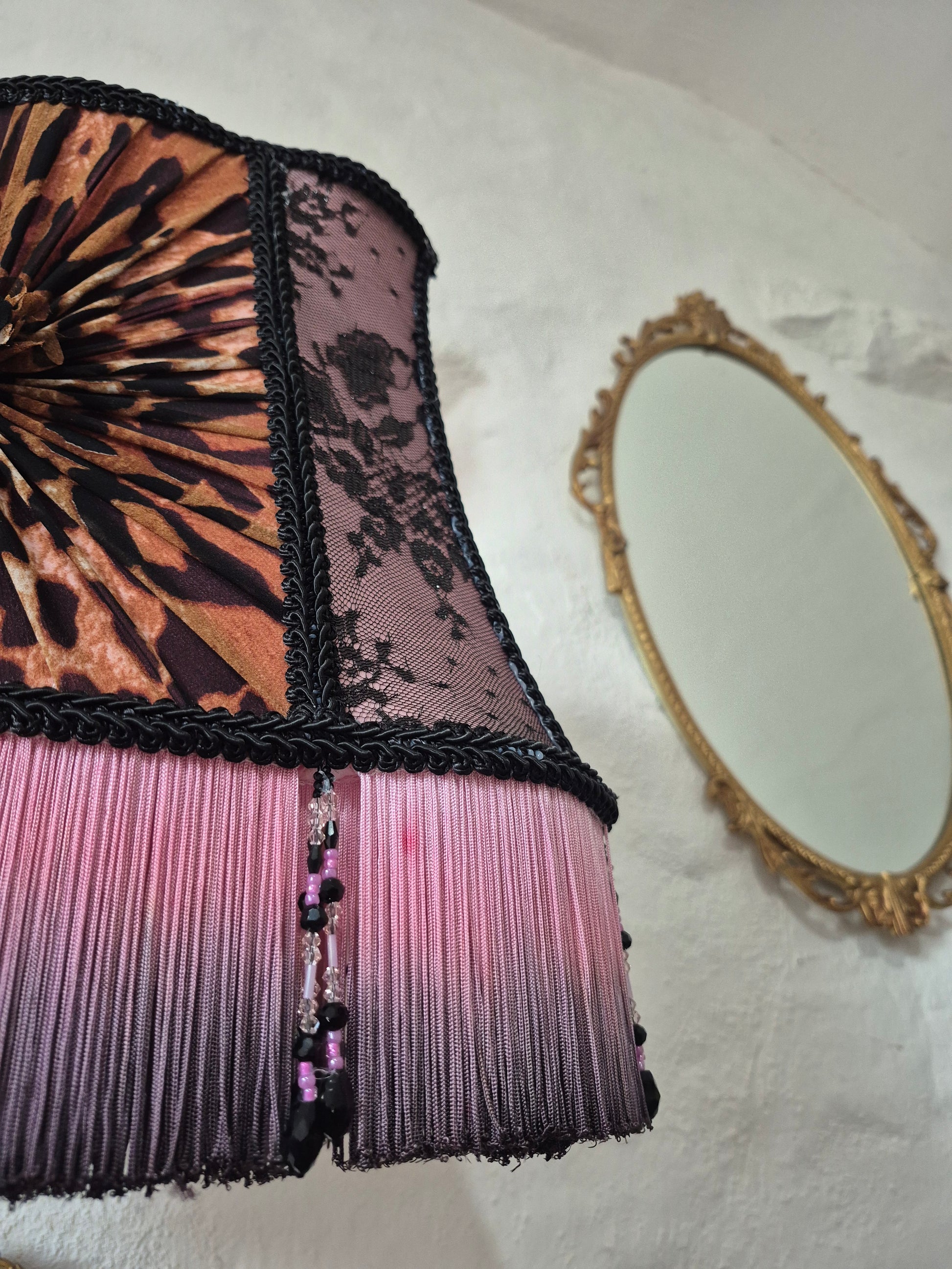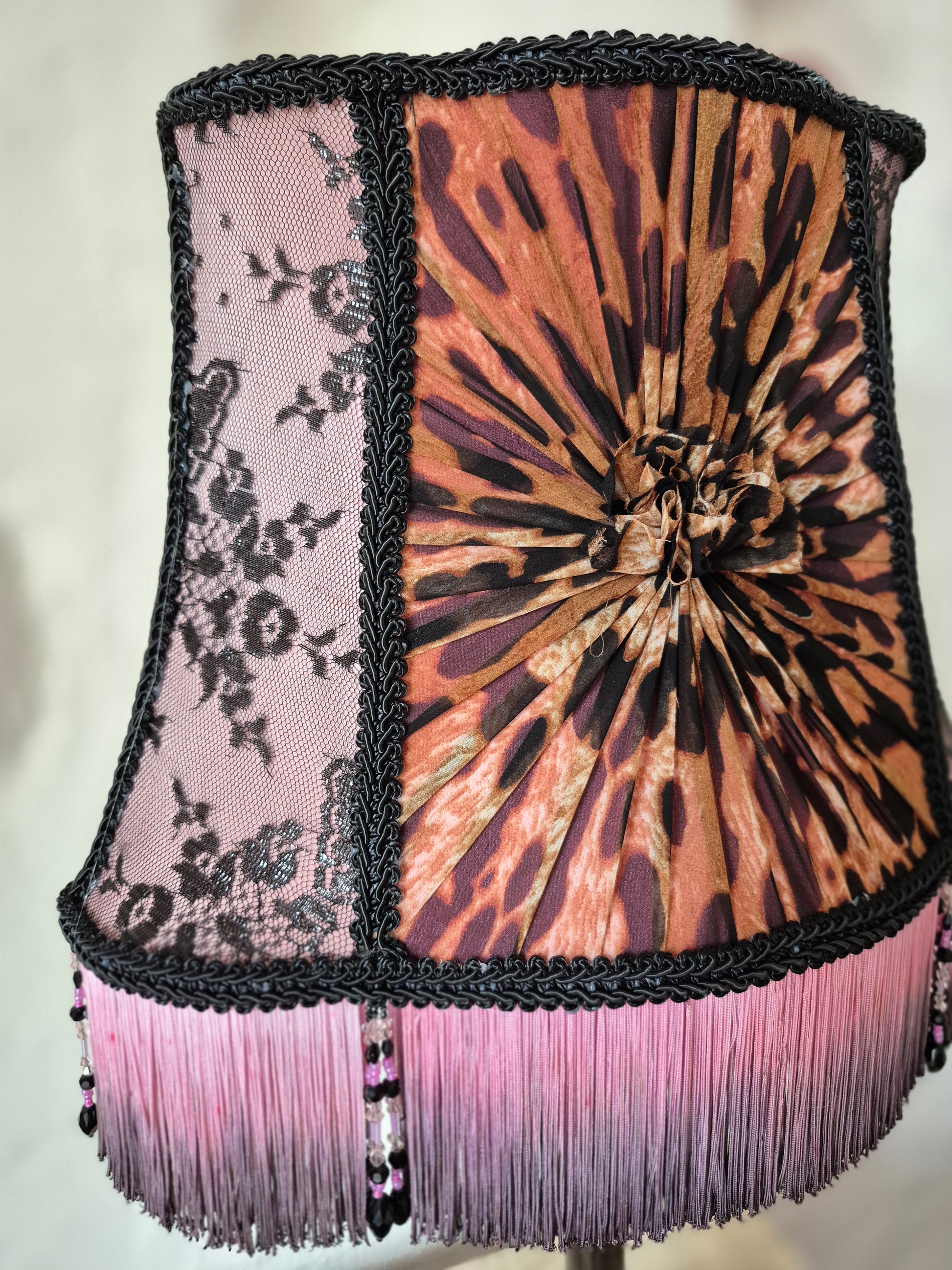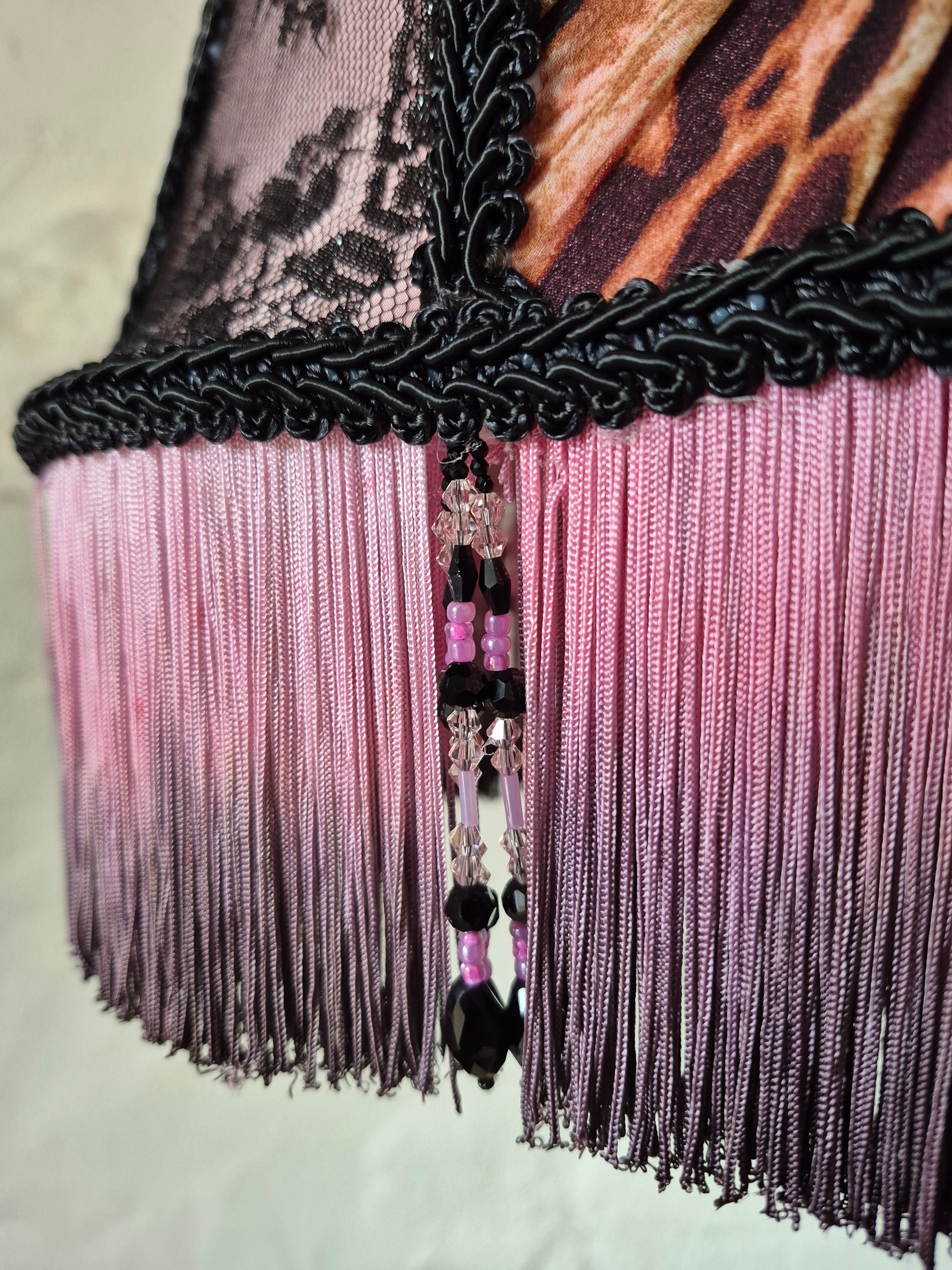 So since she's all business there with her wheelbarrow, I tarted the shade up a little instead, with some brightly dyed pink dupion silks, a gorgeous shimmering sequinned lace, a dip-dyed fringe and some lovely leopard print chiffon I found. I made some little clusters of pink and black beaded strings too.